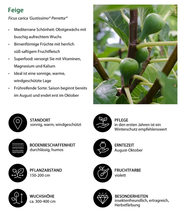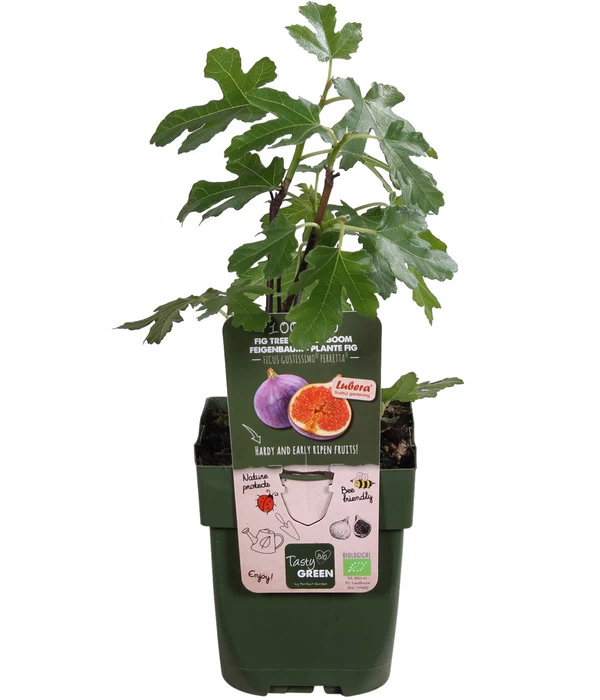 Ein Feigenbaum verbreitet sofort mediterranes Flair in Ihrem Garten und lässt Sie ganz besondere Momente erleben – optisch und kulinarisch. Was für ein Glück, dass sich die Bio Echte Feige ‚Gustissimo® Perretta®‘ auch nördlich der Alpen wohl fühlt und uns mit ihren wohlschmeckenden Früchten beschenkt. Diese sind birnenförmig, haben eine violette Schale und hellrotes Fruchtfleisch. Sie wachsen an einem stattlichen Baum, der eine Höhe von 300-400 cm erreichen kann. Es handelt sich um eine frühreifende Sorte, so dass für Sie die Feigen-Saison bereits im August beginnt, aber erst im Oktober endet. Genießen Sie mit der Bio Echte Feige ‚Gustissimo® Perretta®‘ kleine Auszeiten wie in Bella Italia und machen Sie sich schon jetzt auf die Suche nach vielen Rezepten, denn der Feigenbaum wird Sie mit einer reichen Ernte erfreuen.