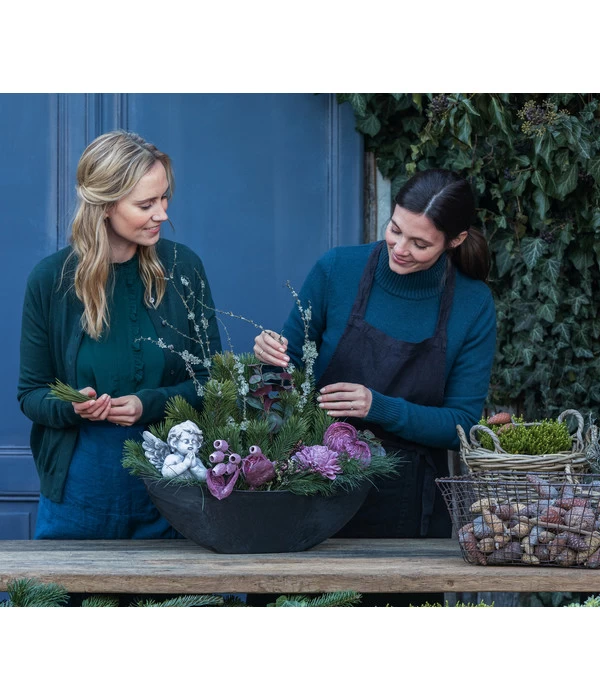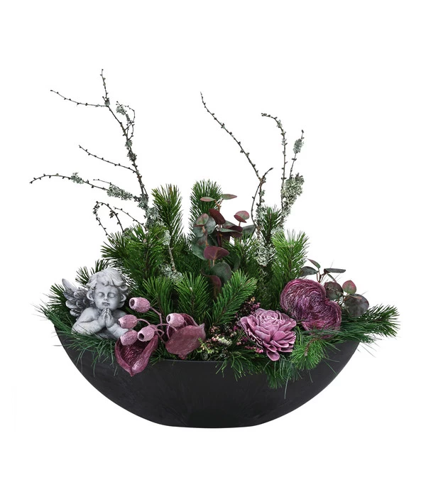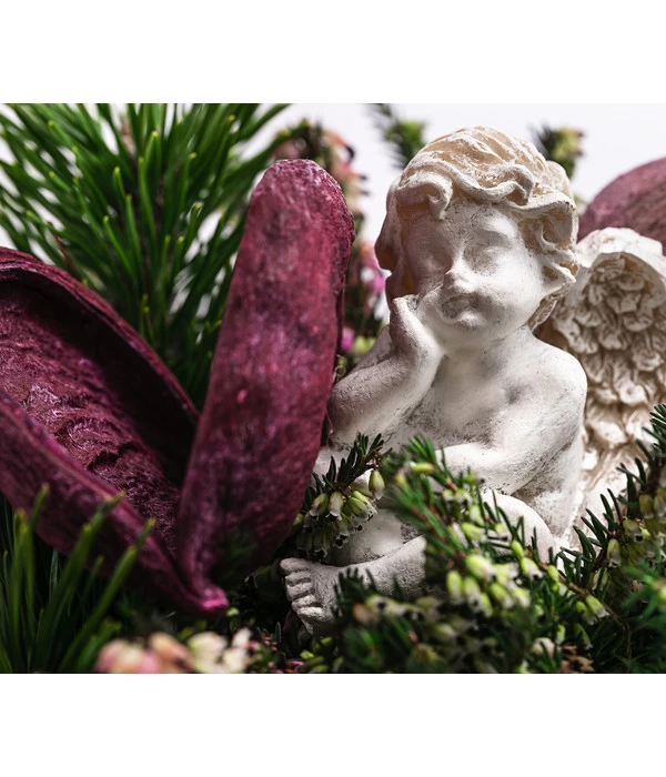 Neben dem wintergrünen Pflanzenset aus Blauschwingel, Knospenheide, Bergkiefer und dekorativen Fruchtständen wurde beim Grabgesteck Unvergessen im Vordergrund des Arrangements auch eine edle Rosenblüte platziert, dem wohl schönsten Sinnbild für die Liebe über den Tod hinaus. Der kleine betende Engel aus wetterfestem Kunststein wacht dagegen über den ewigen Schlaf der Verstorbenen und spendet den Trauernden Trost und Zuversicht, wenn sie das Grab besuchen. Dank der stattlichen Größe und der ovalen Form ist das Grabgesteck Unvergessen ein repräsentativer Winterschmuck auch für größere Gräber.