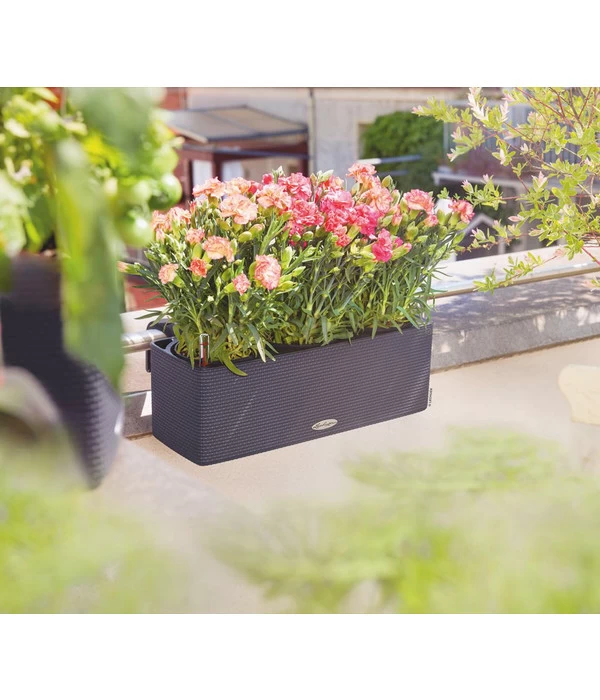 Endlich Frühling! Die Vögel zwitschern vergnügt und machen sich auf die Suche nach sicheren Nistplätzen, und die ersten Gartenpflanzen zeigen grüne Knospen. Juckt es Sie da nicht auch regelmäßig in den Fingern, endlich wieder die Balkonkästen erblühen zu lassen? Vielleicht sollten Sie sich in dieser Saison aber einen lang gehegten Wunsch erfüllen und Ihre herkömmlichen Balkonkästen durch das hochwertige Lechuza® BALCONISSIMA Color All-in-One-Set ersetzen. Das Set bietet Platz für drei Kulturtöpfe mit einem Durchmesser von 12 cm, die Sie einfach neben einander in den Kasten setzen. Ohne umzutopfen, ohne den Balkon und die Hände schmutzig zu machen. Aber immer mit der Gewissheit, dass Ihre Pflanzen im Lechuza® BALCONISSIMA Color All-in-One-Set bestens versorgt sind. Lassen Sie jetzt Ihren Traum vom üppig blühenden Balkon wahr werden! Mit dem im Set enthaltenen Balkonkastenhalter können Sie den Kasten mit wenigen Handgriffen sicher am Balkongeländer anbringen.