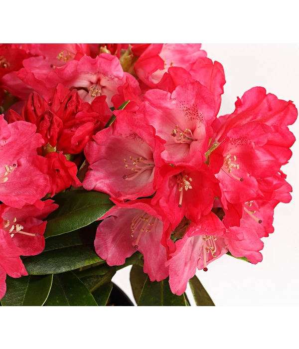Was wäre ein Frühlingsgarten ohne Rhododendren! Den ganzen Winter haben die Pflanzen brav ausgeharrt und mit ihrem immergrünen Blattschmuck Präsenz im Garten gezeigt, doch wenn die Temperaturen langsam steigen, „erwachen“ auch sie und beginnen voller Tatendrang eine Knospe nach der anderen zu öffnen. Und wenig später präsentiert sich Ihnen der Rhododendron ‘Morgenrot‘ über und über mit prachtvollen, intensiv leuchtenden Blüten bedeckt. Und meinen Sie von weitem, es handele sich um rein rote Blüten, werden Sie beim Nähertreten entdecken, dass das Rot im Blüteninneren in ein zartes Rosa übergeht, das zusätzlich mit einer feinen, rotbraunen Zeichnung akzentuiert ist. Ein fantastischer Anblick – aus der Ferne wie aus der Nähe! Noch eine Besonderheit werden Sie am Rhododendron ‘Morgenrot‘ schätzen: Er ist nicht nur unglaublich blühfreudig, seine Blüten duften auch herrlich. Und das ist für Rhododendren nicht selbstverständlich. Der Zierstrauch hat einen dicht verzweigten, kompakten Wuchs und erreicht eine maximale Wuchshöhe von 100-150 cm, das Laub ist tiefgrün und glänzend. Und wann hält ‘Morgenrot‘ Einzug in Ihrem Garten?